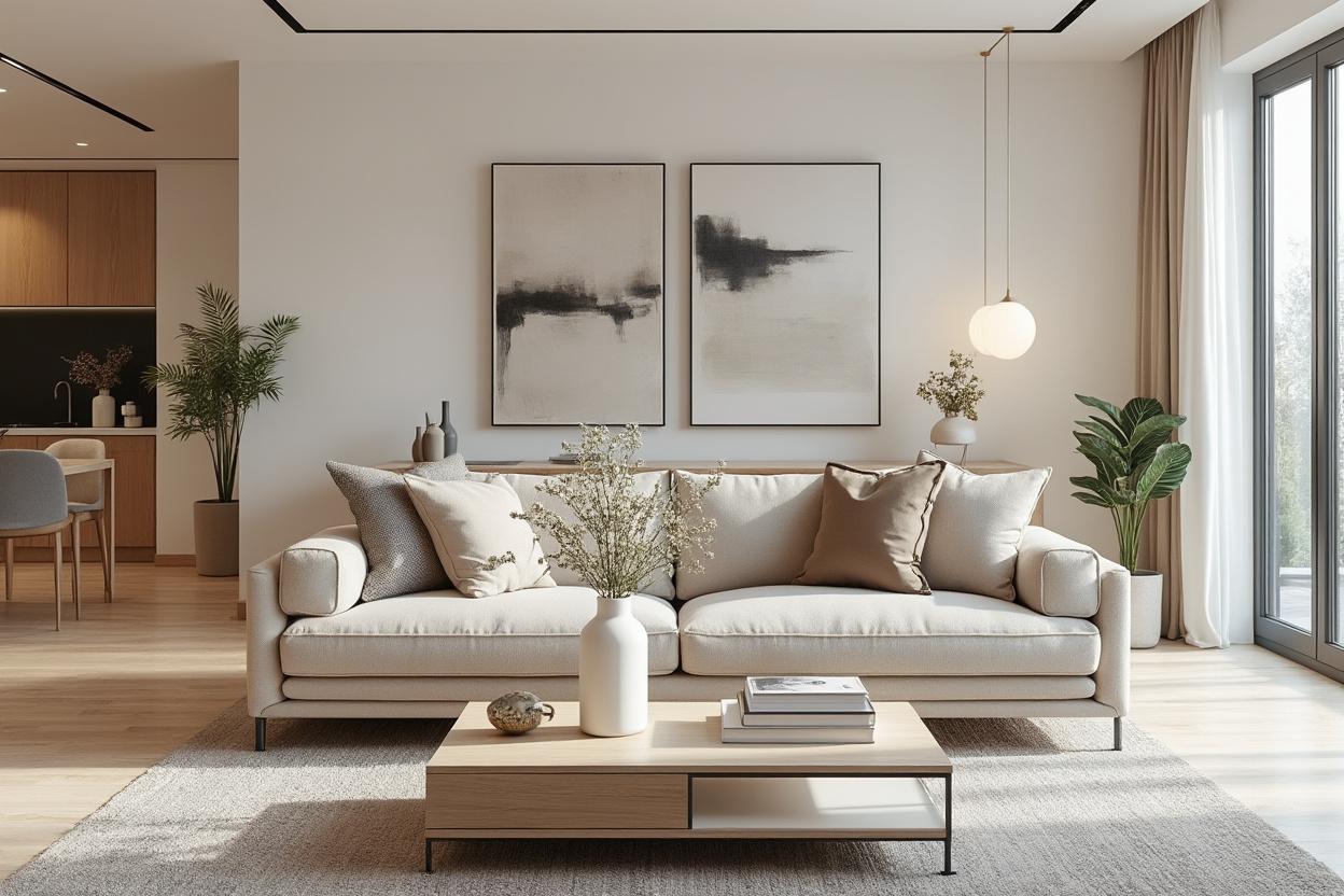 Les tons neutres (beiges doux, gris lumineux, blancs cassés) agrandissent visuellement les pièces et facilitent la projection des acquéreurs. Ils servent de toile de fond pour mettre en avant meubles et accessoires.